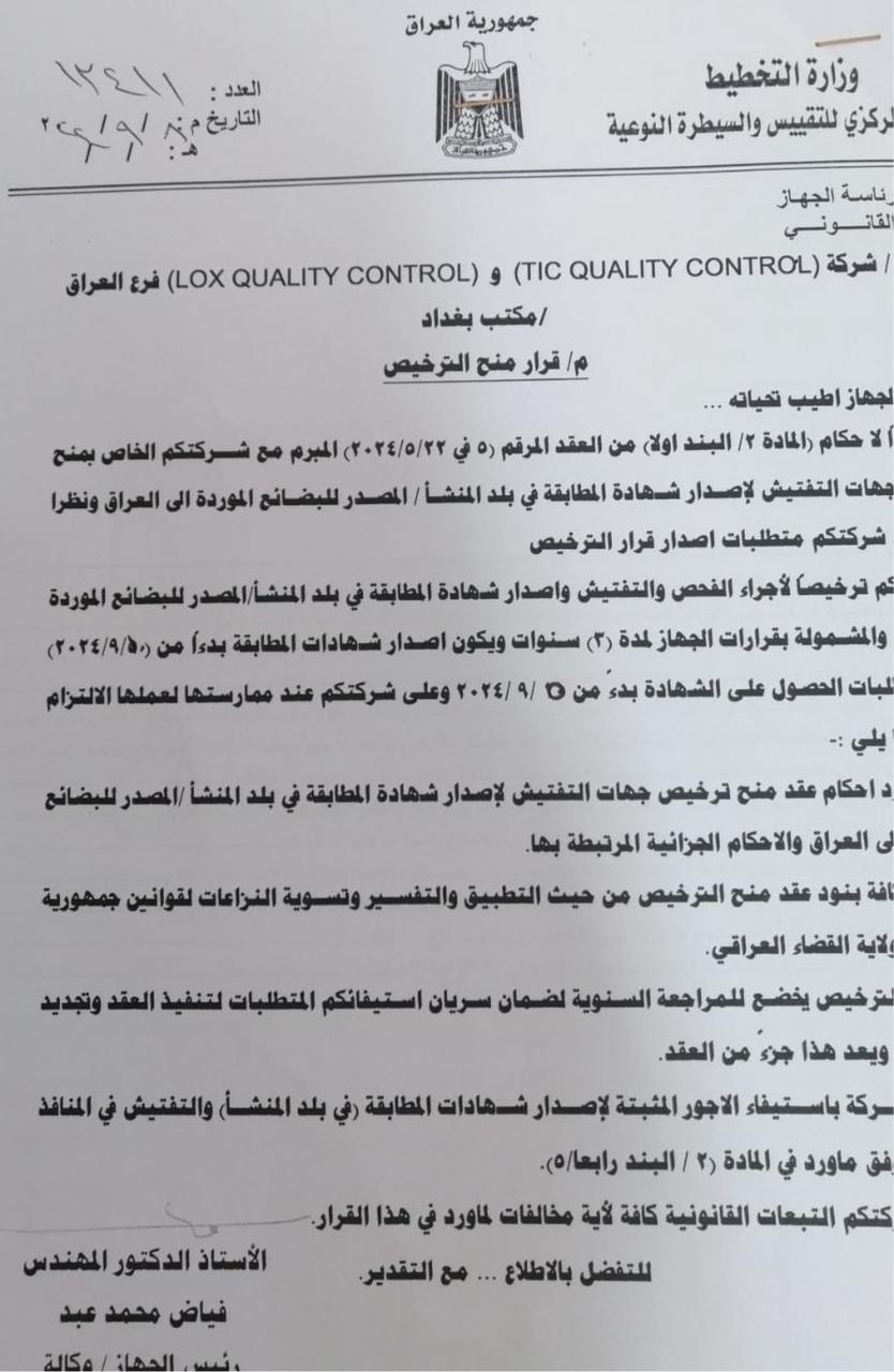 CoC issuance for IraqLOX & TICQC "Partnership" is a quality control service company that takes pride in consulting services and quality solutions in highly competitive environments.